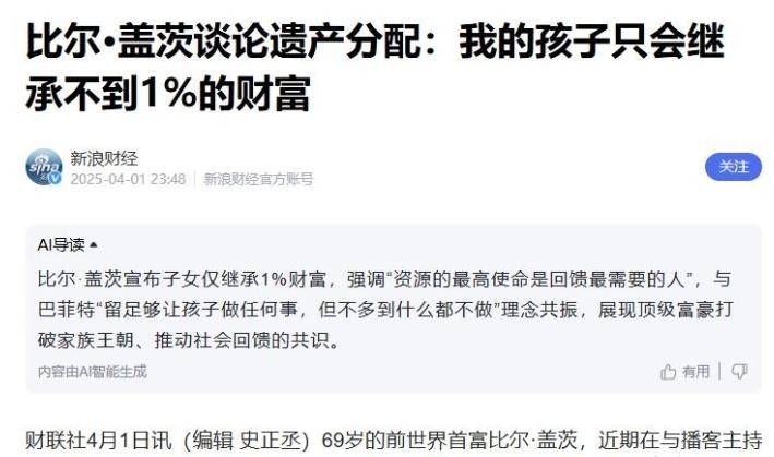 45编号:盖茨早已公开承诺,将把95%的财产投入慈善基金会,留给三位子女的遗产总计不超过1%。
